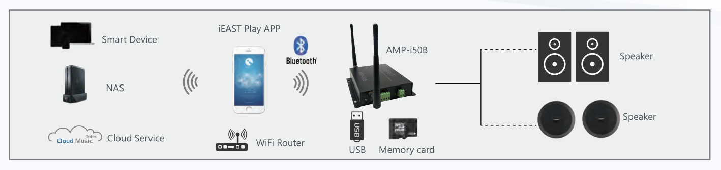 Uygun güce sahip pasif hoparlörlere bağlanan iEAST StreamAmp AMP-i50, geleneksel ses sisteminizi kablosuz hale getirerek kablosuz ses sistemini çok daha rahat bir şekilde kontrol etmenizi sağlar.