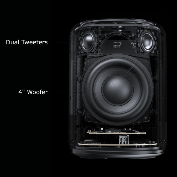 Zengin ve detaylı ses için 4” woofer + çift tweeter.