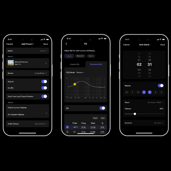 EQ : Cihaz üzerinde hızlı EQ; uygulamada gelişmiş EQ (hazır ayarlar + özel); Wi-Fi/Ethernet, Bluetooth ve Aux için ayrı EQ ayarları.